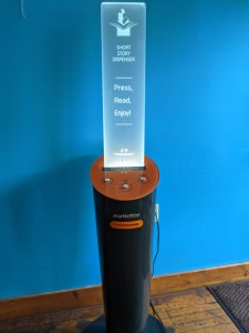 I have never seen a Short Story Dispenser before, and I was surprised I was the only one admiring its beauty and genius. There are three buttons: Press 1 for a short, 1-minute story; 2, for a 3-minute story; 3, for a children’s story. So, I did, and the dispenser printed out my selected story on paper that reminded me of one of the long receipts that some retail stores print, except the stories were interesting. (looking at you, national drug store chain, and you know who you are.)