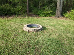 We walked around our property while we discussed the best site for our “new” fire pit. After we considered several spots, we decided on a location in the backyard that was relatively flat;  we also decided that our folding camping chairs would be more comfortable than the concrete benches and would make mowing around the fire pit easier. We relocated our concrete benches to be near near the chicken coop, so we would have somewhere to sit while we watched the chickens and their latest antics.